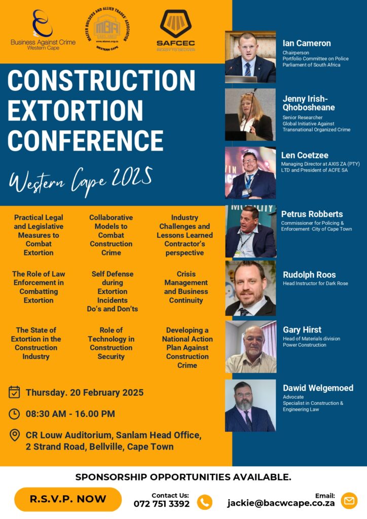 SAFCEC along with other Construction NPOs will be hosting the Construction Extortion Conference. The intended date for the conference is 20 February 2025 from 08:30-16:00.